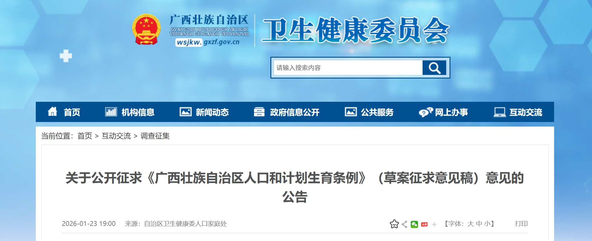 1月23日,广西壮族自治区卫生健康委员会网站发布公告,公布《广西壮族自治区人口和计划生育条例》(草案征求意见稿)并征求意见。征求意见截止日期为2026年2月23日。